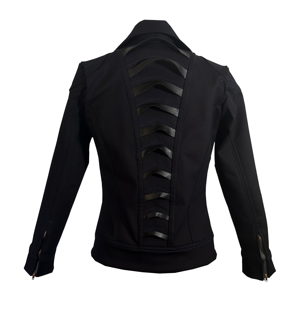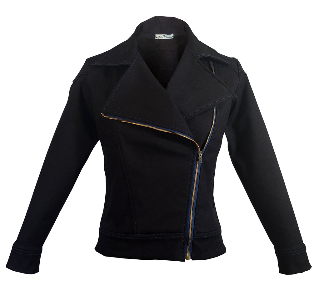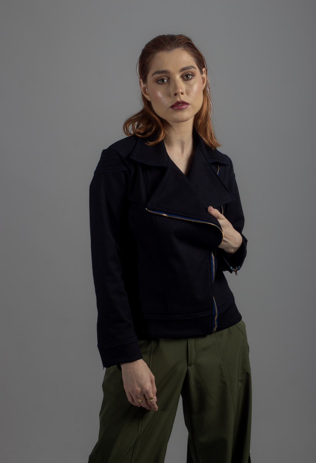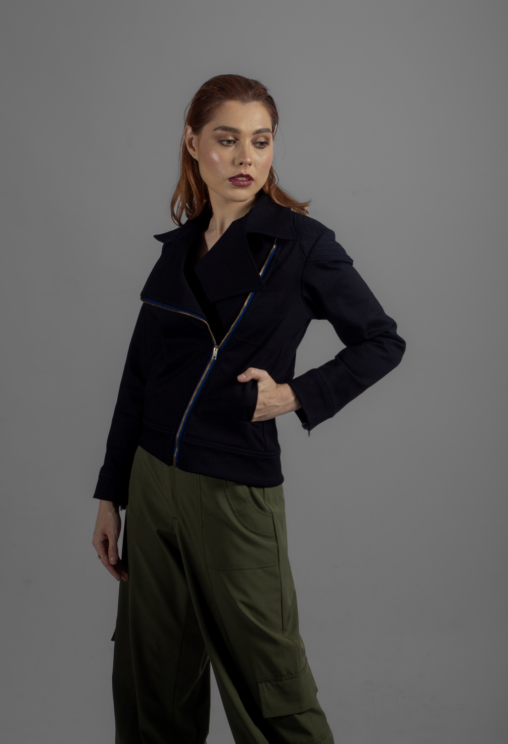 This biker jacket is the perfect rebel element in your wardrobe, long sleeve, reinforced in neck and wrists, pockets and a beautiful back piece in leather. It comes in dark blue with black.